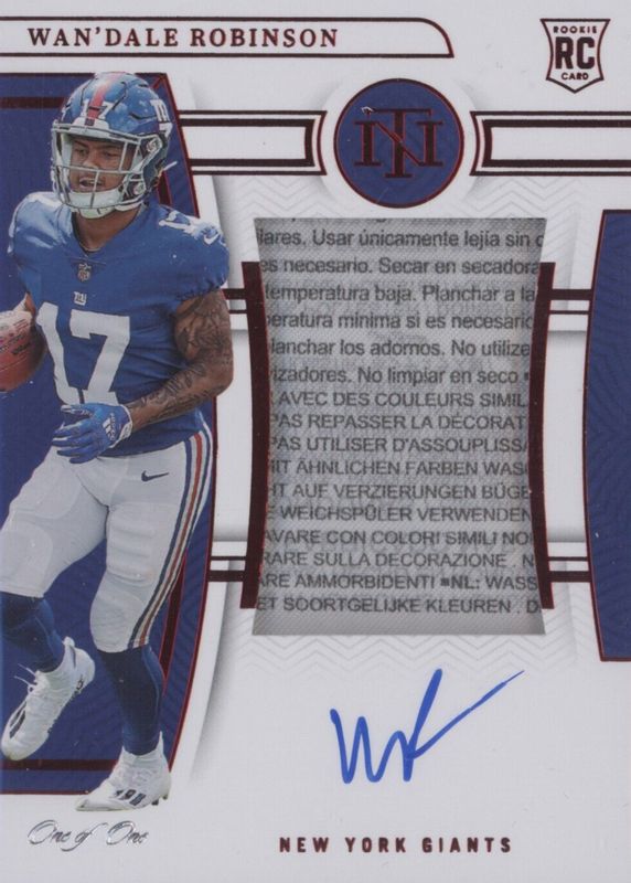 The Wan'Dale Robinson 2022 National Treasures #177 Rookie Patch Auto - Red Laundry Tag /1 card in Raw condition has not changed in price in the last 30 days and was last sold for $230.50 .