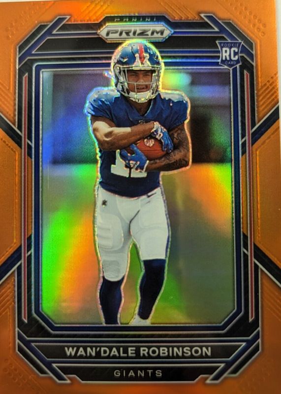 The Wan'Dale Robinson 2022 Prizm #315 Orange /249 Rookie card in Raw condition has moved up $0.27 (+21.6%) in the last 30 days and was last sold for $1.52 .