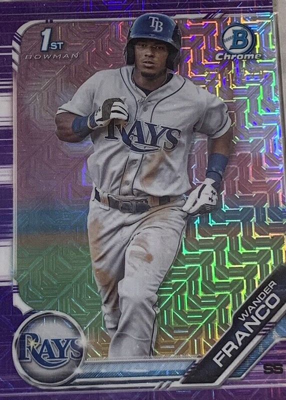 The Wander Franco 2019 Bowman Mega Box #BCP-100 Chrome Prospects - Purple Mojo Refractor /250 (1st) card in Raw condition has not changed in price in the last 30 days and was last sold for $22.50 .