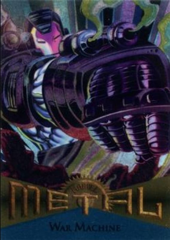 The War Machine 1995 Marvel Metal #27 Base card is 1 of 4 War Machine's card variations in the 1995 Marvel Metal set being tracked by Sports Card Investor, including Silver Flasher, Gold Blasters, and Metal Blasters.