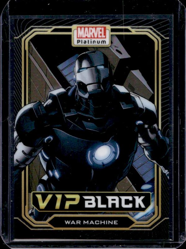 The War Machine 2023 Upper Deck Marvel Platinum #VIP-1 VIP Black Achievements card is 1 of 45 War Machine's card variations in the 2023 Upper Deck Marvel Platinum set being tracked by Sports Card Investor, including Base, Black Rainbow, Blue Rainbow, Blue Surge, and Purple Rainbow.