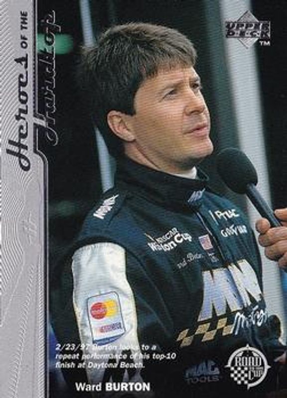 The Ward Burton 1997 Upper Deck Road to the Cup #33 Base card is 1 of 5 Ward Burton's card variations in the 1997 Upper Deck Road to the Cup set being tracked by Sports Card Investor, including Base, Predictor Plus, Predictor Plus Cels Die Cuts Exchange, and Predictor Plus Cels Exchange.