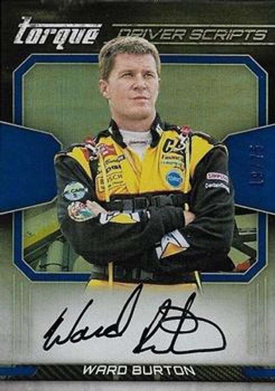 The Ward Burton 2017 Torque NASCAR #DS-WB Driver Scripts Blue /75 card is 1 of 11 Ward Burton's card variations in the 2017 Torque NASCAR set being tracked by Sports Card Investor, including Clear Vision, Driver Scripts, Clear Vision Gold /149, Clear Vision Blue /99, and Clear Vision Red /49.