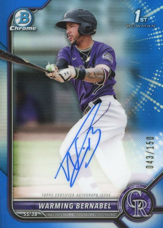 Warming Bernabel's Baseball cards are available in at least 8 sets. Warming Bernabel's biggest 7-day price movers are 2022 Bowman #CPA-WB Chrome Prospect Auto - Blue Refractor /150 (1st), 2022 Bowman #BCP-46 Chrome Prospects - Aqua Refractor /125 (1st), and 2022 Bowman #BCP-46 Chrome Prospects - Speckle Refractor /299 (1st).