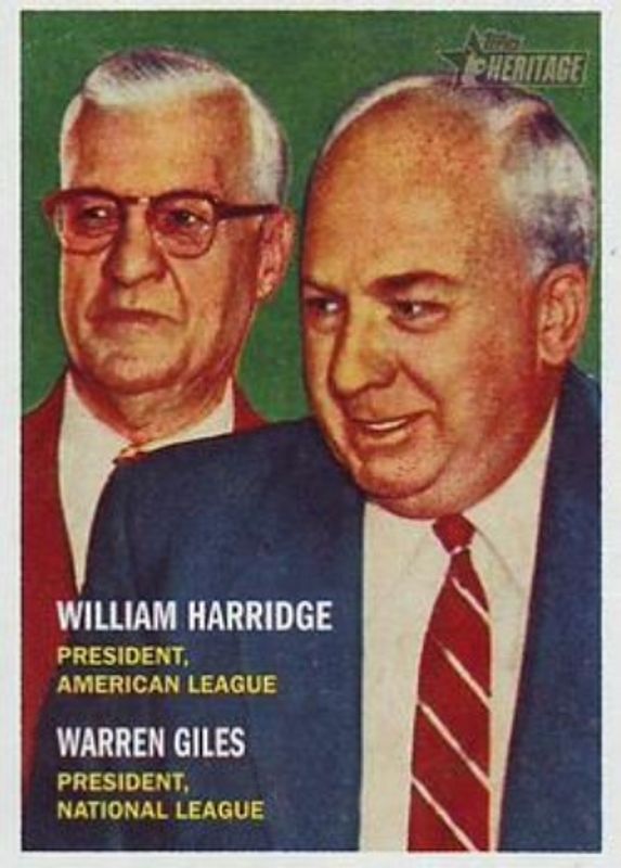 The Warren Giles / Will Harridge 2006 Topps Heritage #100 Base card is 1 of 4 Warren Giles / Will Harridge's card variations in the 2006 Topps Heritage set being tracked by Sports Card Investor, including Chrome /1957, Chrome Refractor /557, and Chrome Black Refractor /57.