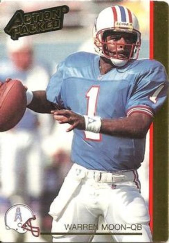 The Warren Moon 1992 Action Packed #282 Base card is 1 of 5 Warren Moon's card variations in the 1992 Action Packed set being tracked by Sports Card Investor, including #98 Base, #282 Mint /500, #98 Mint /500, and #18G 24 Kt. Gold.