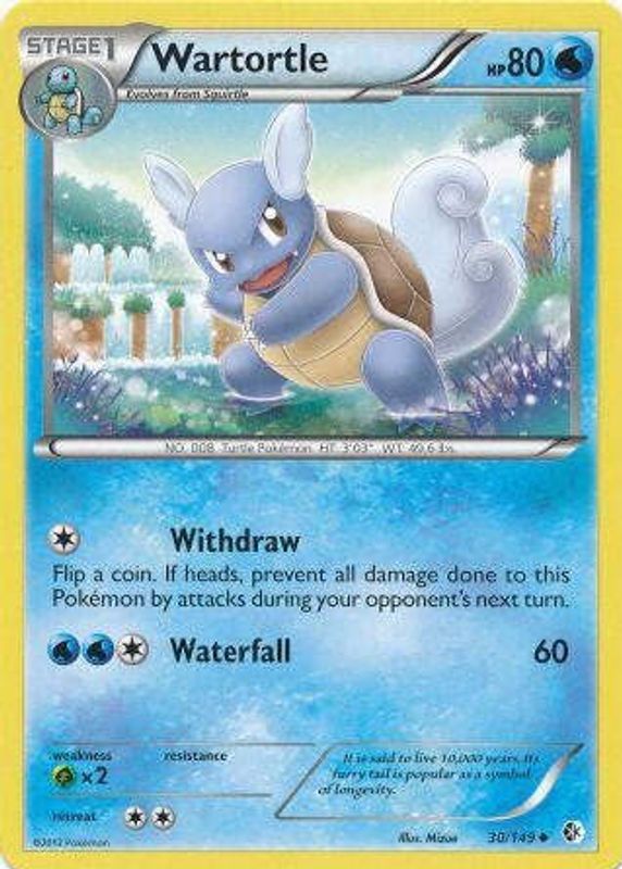 The Wartortle 2012 Black & White: Boundaries Crossed #030/149 Base card in Raw TCG (Lightly Played) condition has moved down -$0.68 (-29.7%) in the last 30 days and was last sold for $1.60 .