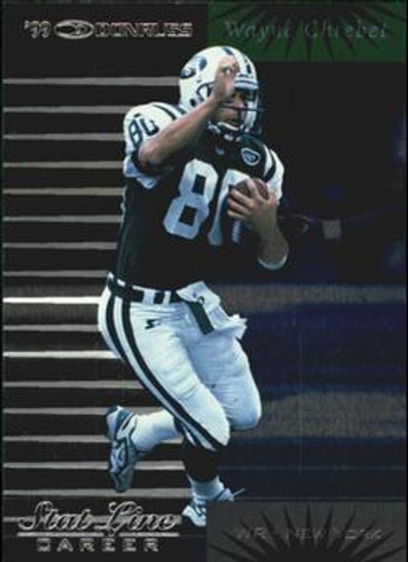 The Wayne Chrebet 1999 Donruss #90 Stat Line Career /223 card is 1 of 3 Wayne Chrebet's card variations in the 1999 Donruss set being tracked by Sports Card Investor, including Base, and Stat Line Season /14.