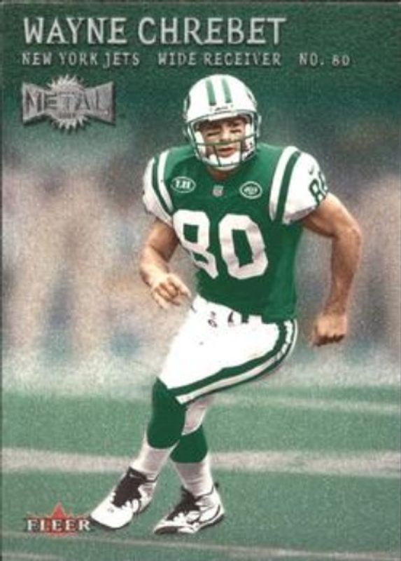 The Wayne Chrebet 2000 Metal #51 Emerald card is 1 of 2 Wayne Chrebet's card variations in the 2000 Metal set being tracked by Sports Card Investor, including Base.