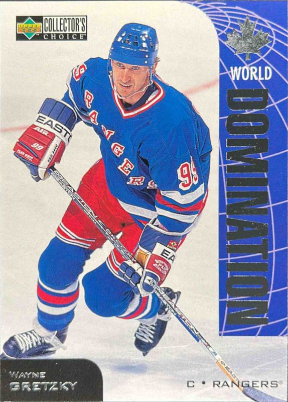 The Wayne Gretzky 1997 Upper Deck Collector's Choice #W1 World Domination card is 1 of 14 Wayne Gretzky's card variations in the 1997 Upper Deck Collector's Choice set being tracked by Sports Card Investor, including #4 Blow Ups 4x6 (6 card sets), #1 Blow Ups 5x7 (5 card set), #S1 Hockey Stick Ums, #MM3 Magic Men, and #MM4 Magic Men.