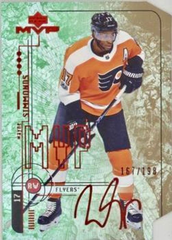 The Wayne Simmonds 2018 Upper Deck MVP #26 20th Anniversary Colors & Contours /198 card is 1 of 16 Wayne Simmonds' card variations in the 2018 Upper Deck MVP set being tracked by Sports Card Investor, including Base, Factory Set Blue, Green Script, Puzzle Back, and Silver Script.