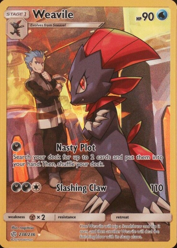 The Weavile 2019 Sun & Moon: Cosmic Eclipse #238/236 Holo (Secret) card in Raw TCG (Near Mint) condition has moved up $2.49 (+33.2%) in the last 30 days and was last sold for $9.99 .