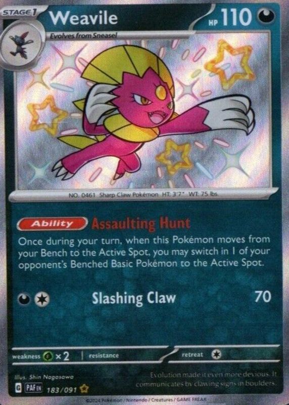 The Weavile 2024 Scarlet & Violet: Paldean Fates #183/091 Shiny Rare card in Raw TCG (Near Mint) condition has moved down -$2.71 (-36.4%) in the last 30 days and was last sold for $4.73 .