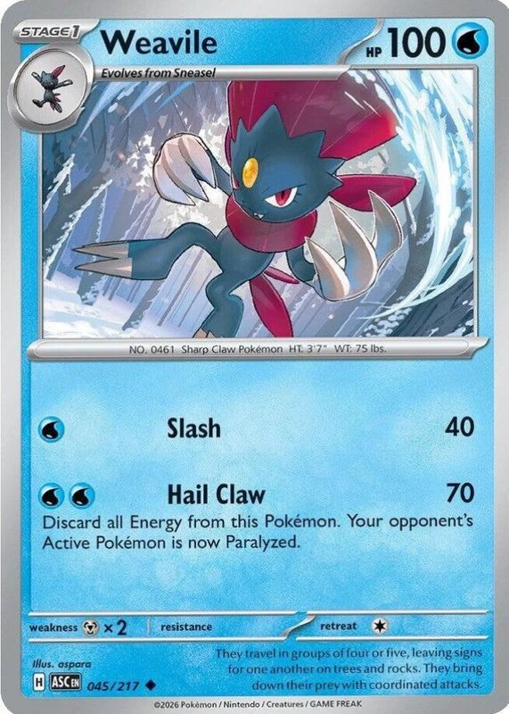 The Weavile 2026 Mega Evolution: Ascended Heroes #45/217 Base card in Raw TCG (Near Mint) condition has not changed in price in the last 30 days and was last sold for $1.99 .