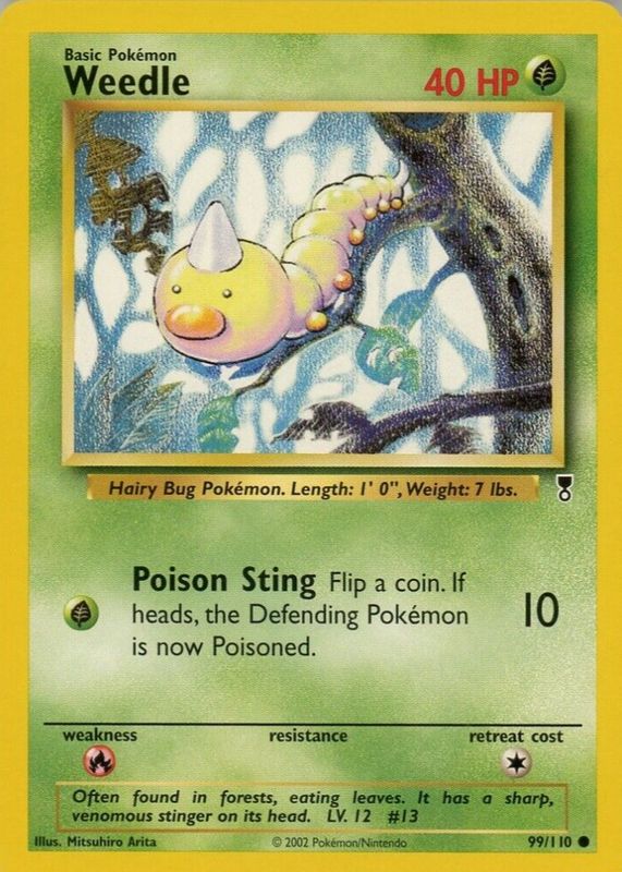 The Weedle 2002 Legendary Collection #99 Base card in Raw TCG (Near Mint) condition has not changed in price in the last 30 days and was last sold for $1.99 .