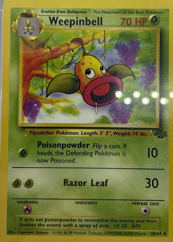 The Weepinbell 1999 Jungle #48/64 Unlimited card in Raw TCG (Near Mint) condition has moved up $1.93 (+91.5%) in the last 30 days and was last sold for $4.04 .