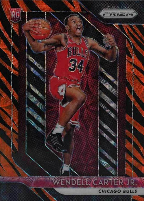 The Wendell Carter Jr. 2018 Prizm #80 Choice Tiger Stripe /(SSP) Rookie card in Raw condition has not changed in price in the last 30 days and was last sold for $12.50 .