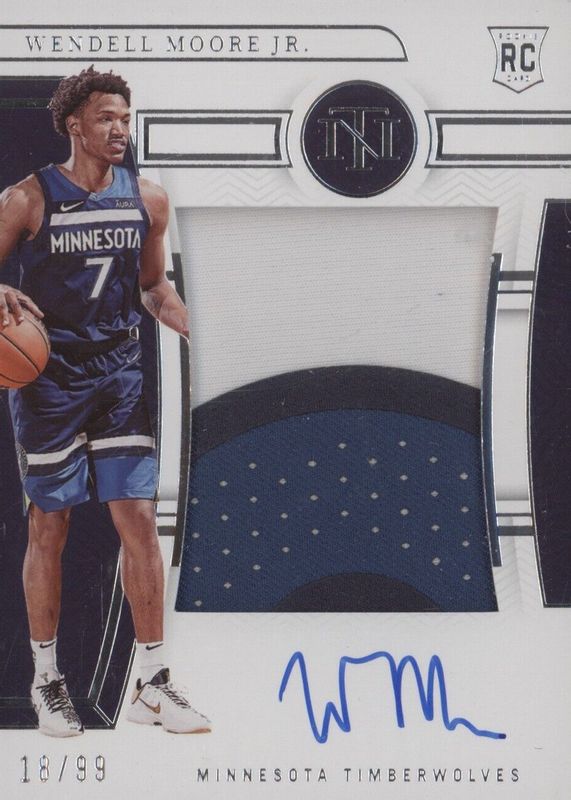 The Wendell Moore Jr. 2022 National Treasures #118 Rookie Patch Auto /99 card in Raw condition has not changed in price in the last 30 days and was last sold for $57.03 .