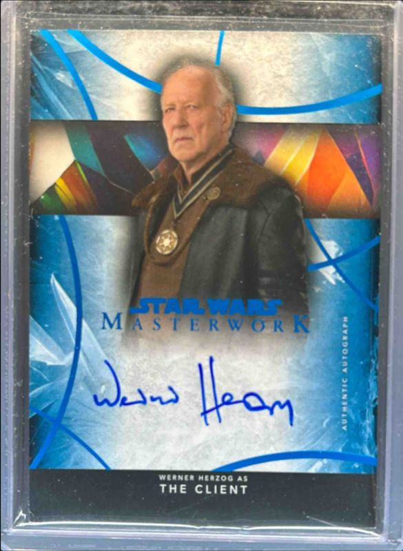 The Werner Herzog 2024 Topps Star Wars Masterwork #A-WH Autographs - Blue Foil /99 card is 1 of 11 Werner Herzog's card variations in the 2024 Topps Star Wars Masterwork set being tracked by Sports Card Investor, including Autographs, Autographs - Rainbow Foil /50, Autographs - Canvas /25, Autographs - Wood /10, and Autographs - Silver Framed /5.