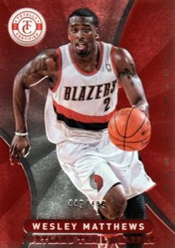 The Wesley Matthews 2012 Totally Certified #139 Totally Red /499 card is 1 of 26 Wesley Matthews' card variations in the 2012 Totally Certified set being tracked by Sports Card Investor, including Base, Totally Blue /299, Totally Gold /25, Totally Green /5, and Printing Plate Black /1.
