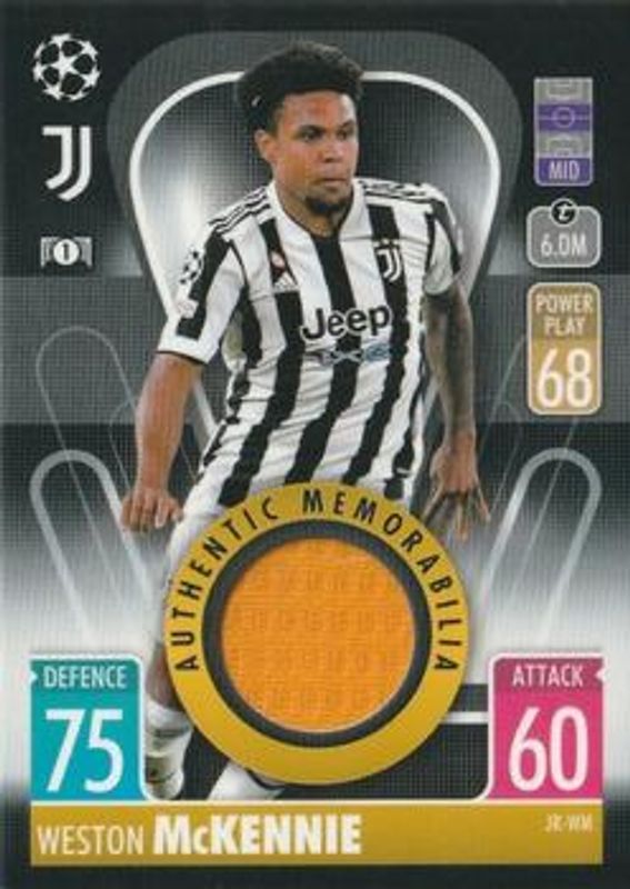 The Weston McKennie 2021 Topps Match Attax Champions & Europa League #JR-WM Jersey Relic card is 1 of 3 Weston McKennie's card variations in the 2021 Topps Match Attax Champions & Europa League set being tracked by Sports Card Investor, including Base, and Crystal.