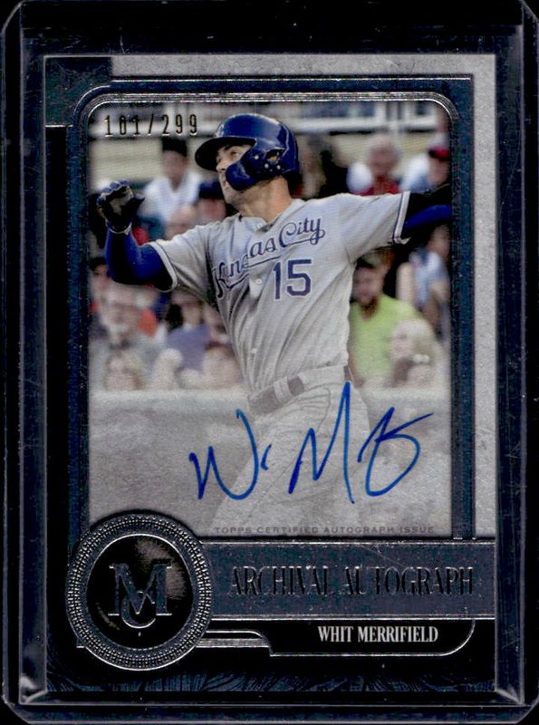 The Whit Merrifield 2019 Topps Museum Collection #AA-WM Archival Autographs /99 card is 1 of 28 Whit Merrifield's card variations in the 2019 Topps Museum Collection set being tracked by Sports Card Investor, including Base, Copper, Sapphire /150, Amethyst /99, and Ruby /50.