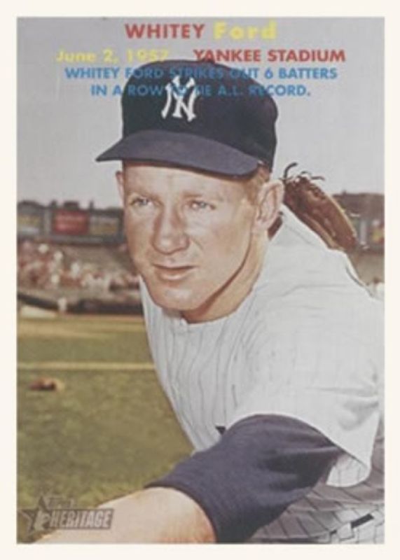The Whitey Ford 2006 Topps Heritage #FB-WF Flashbacks card is 1 of 4 Whitey Ford's card variations in the 2006 Topps Heritage set being tracked by Sports Card Investor, including Flashbacks Seat Relics, Real One Autographs, and Real One Autographs - Red Ink /57.
