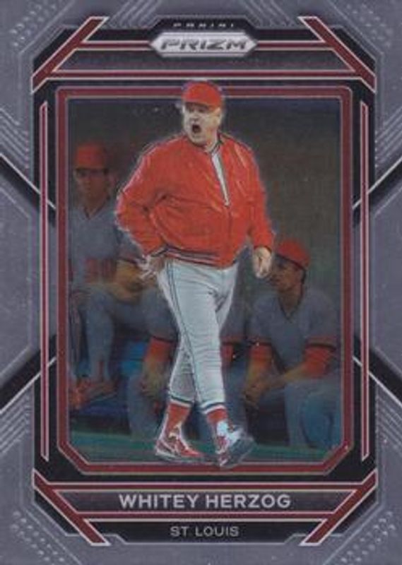 The Whitey Herzog 2023 Prizm #276 Base card is 1 of 26 Whitey Herzog's card variations in the 2023 Prizm set being tracked by Sports Card Investor, including Blue Ice, Giraffe, Green Ice, Hyper, and Ice.