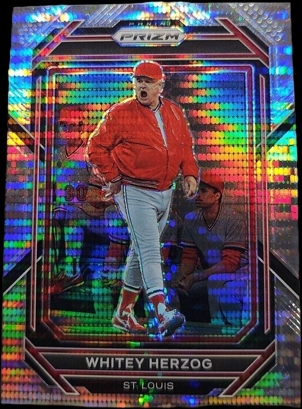 The Whitey Herzog 2023 Prizm #276 Pulsar card is 1 of 26 Whitey Herzog's card variations in the 2023 Prizm set being tracked by Sports Card Investor, including Base, Blue Ice, Giraffe, Green Ice, and Hyper.