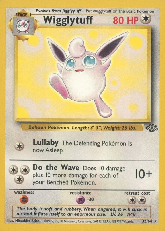 The Wigglytuff 1999 Jungle #32/64 Unlimited card in Raw TCG (Near Mint) condition has moved up $6.07 (+101%) in the last 30 days and was last sold for $12.06 .