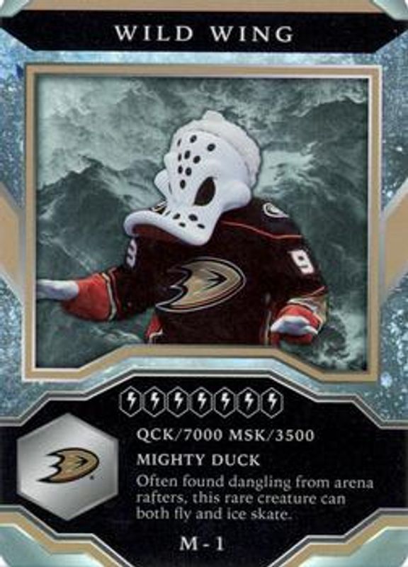The Wild Wing 2021 Upper Deck MVP #M-1 Mascots Gaming card is 1 of 6 Wild Wing's card variations in the 2021 Upper Deck MVP set being tracked by Sports Card Investor, including Mascots Gaming Sparkle, Mascot Gaming - Printing Plates Black /1, Mascot Gaming - Printing Plates Cyan /1, Mascot Gaming - Printing Plates Magenta /1, and Mascot Gaming - Printing Plates Yellow /1.