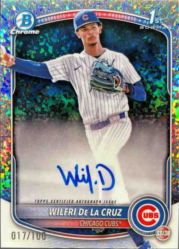 This card is 1 of 88 Wilfri De La Cruz's card variations in the 2025 Bowman Chrome set being tracked by Sports Card Investor, including International Refractor Variation, Prospect Auto (1st), Prospect Auto - Black & White Shimmer Refractor (1st), Prospects (1st), and Prospects - Mini-Diamond Refractor (1st).
