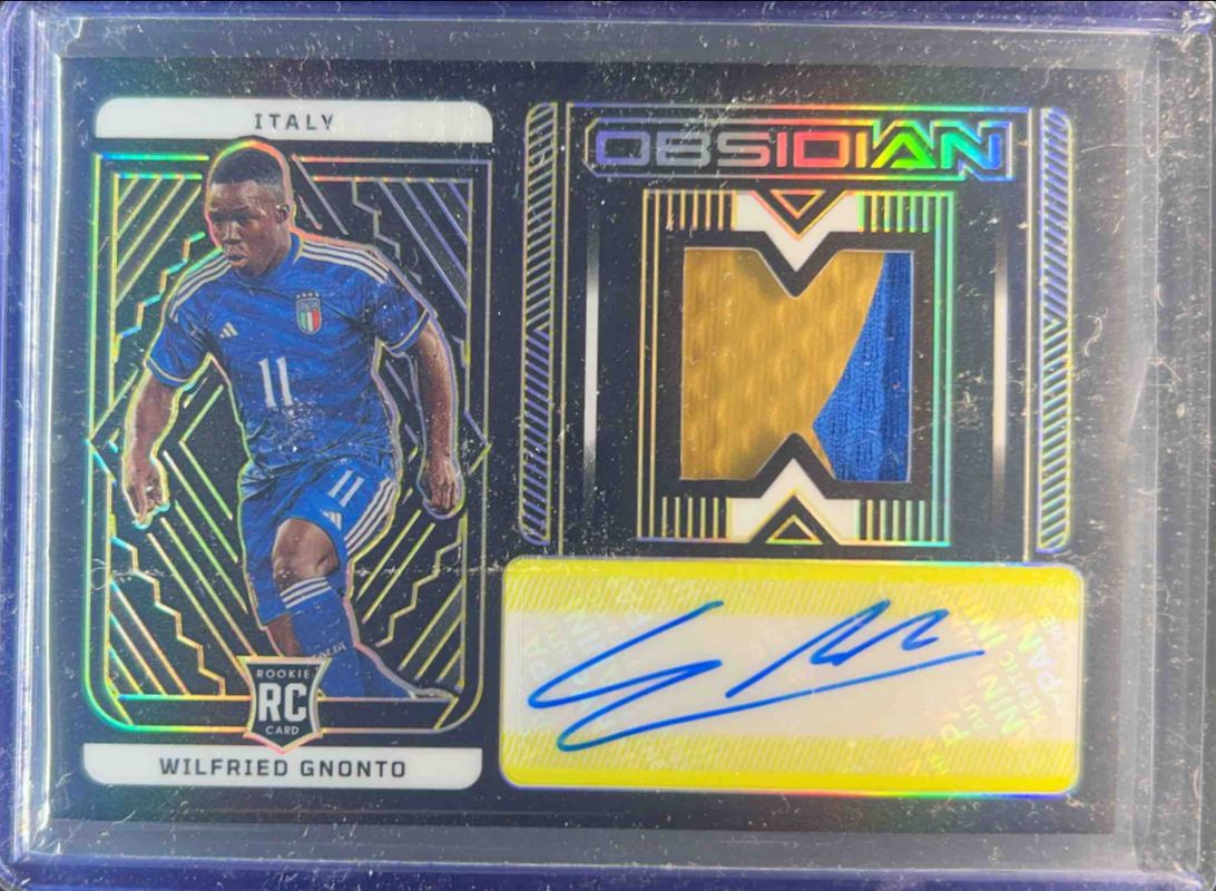 The Wilfried Gnonto 2022 Obsidian #JA-WGO Jersey Autographs - Electric Etch Yellow /10 Rookie card is 1 of 12 Wilfried Gnonto's card variations in the 2022 Obsidian set being tracked by Sports Card Investor, including Jersey Autographs /199, Jersey Autographs - Electric Etch Red Pulsar /44, Jersey Autographs - Electric Etch Red Flood /8, Jersey Autographs - Electric Etch Green /5, and Jersey Autographs - Electric Etch Blue Finite /1.
