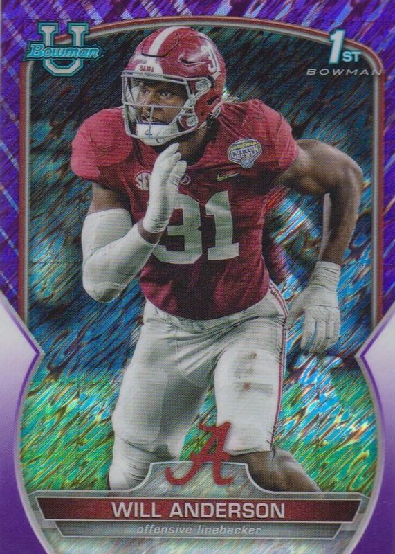 The Will Anderson Jr. 2022 Bowman Chrome University #52 Prospects - Purple Shimmer Refractor (1st) card in Raw condition has not changed in price in the last 30 days and was last sold for $4.25 .