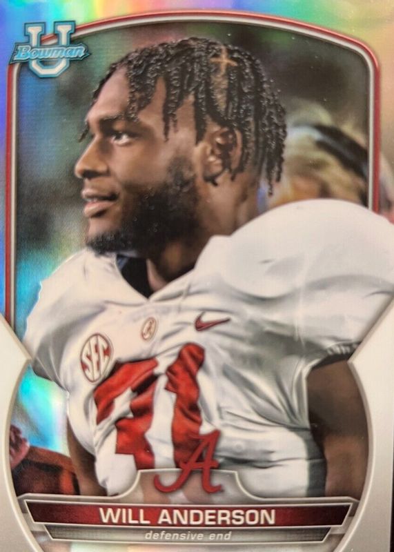 This card is 1 of 49 Will Anderson Jr.'s card variations in the 2022 Bowman Chrome University set being tracked by Sports Card Investor, including Prospects (1st), Prospects - Pink Refractor (1st), Prospects - Purple Shimmer Refractor (1st), Prospects - Refractor (1st), and Prospects - Purple Mini-Diamond Refractor /399 (1st).