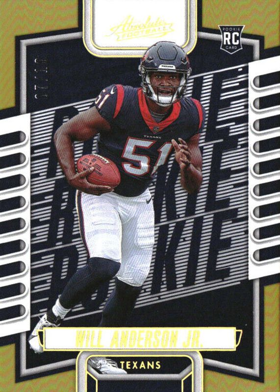 The Will Anderson Jr. 2023 Absolute #103 Gold Spectrum /10 Rookie card in Raw condition has not changed in price in the last 30 days and was last sold for $82.00 .