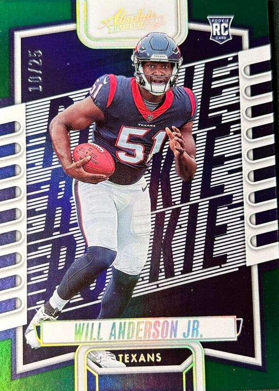 The Will Anderson Jr. 2023 Absolute #103 Green Spectrum /25 Rookie card in Raw condition has not changed in price in the last 30 days and was last sold for $3.28 .