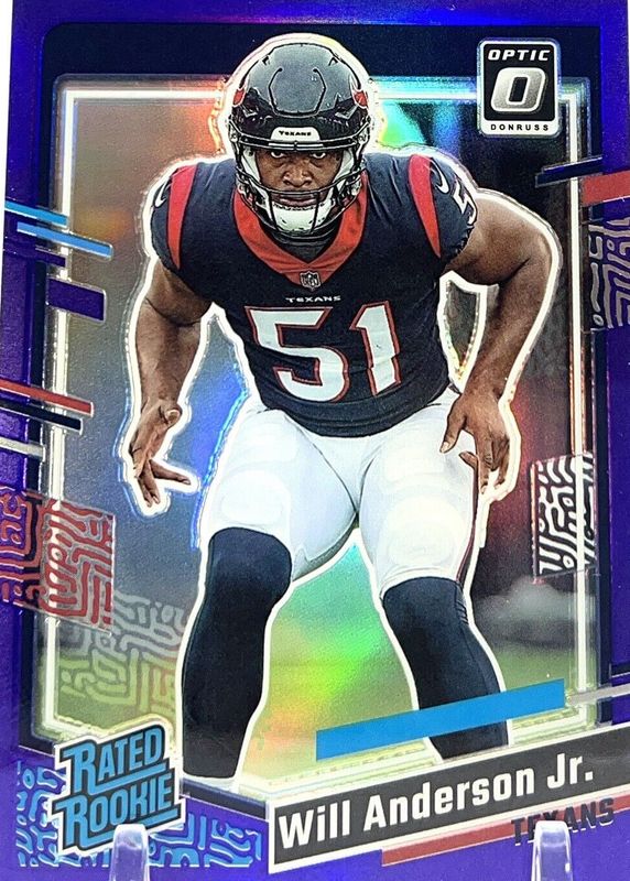The Will Anderson Jr. 2023 Donruss #342 Optic Preview - Purple /50 Rookie card in Raw condition has not changed in price in the last 30 days and was last sold for $35.00 .