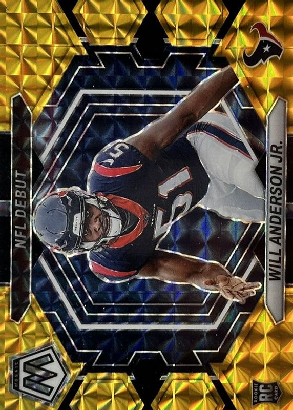 The Will Anderson Jr. 2023 Mosaic #ND-19 NFL Debut - Choice Black Gold /8 Rookie card in Raw condition has not changed in price in the last 30 days and was last sold for $100.00 .