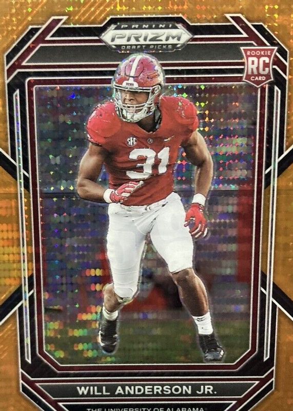 The Will Anderson Jr. 2023 Prizm Draft Picks #162 Orange Pulsar /49 Rookie card in Raw condition has not changed in price in the last 30 days and was last sold for $3.03 .