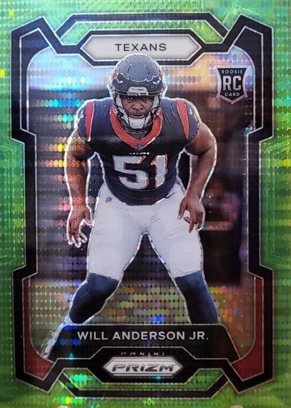 The Will Anderson Jr. 2023 Prizm #342 Neon Green Pulsar Rookie card in Raw condition has moved up $0.75 (+33.3%) in the last 30 days and was last sold for $3.00 .