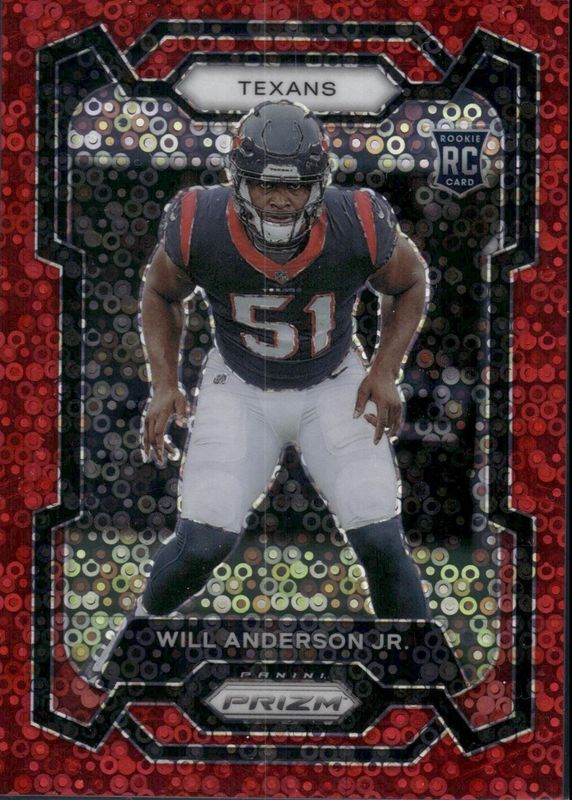 The Will Anderson Jr. 2023 Prizm #342 No Huddle Red /70 Rookie card in Raw condition has not changed in price in the last 30 days and was last sold for $5.50 .