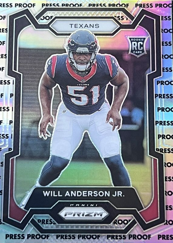 The Will Anderson Jr. 2023 Prizm #342 Press Proof /(SSP) Rookie card in Raw condition has not changed in price in the last 30 days and was last sold for $56.00 .