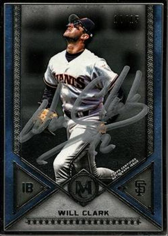 The Will Clark 2019 Topps Museum Collection #MFA-BB Museum Framed Autographs - Silver /15 card is 1 of 9 Will Clark's card variations in the 2019 Topps Museum Collection set being tracked by Sports Card Investor, including Archival Autographs /99, Archival Autographs - Copper /50, Archival Autographs - Gold /25, Superstar Showpieces Autographs /25, and Museum Framed Autographs - Gold /10.