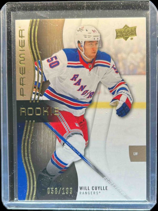 The Will Cuylle 2023 Upper Deck Premier #120 Bronze /199 Rookie card is 1 of 37 Will Cuylle's card variations in the 2023 Upper Deck Premier set being tracked by Sports Card Investor, including Base /399, Gold /65, Ruby /49, Rose Gold /25, and Fight Strap /15.