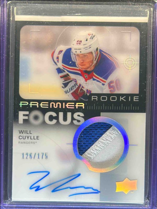 The Will Cuylle 2023 Upper Deck Premier #PFR-WC Premier Focus Auto Patch Rookies /50 card is 1 of 37 Will Cuylle's card variations in the 2023 Upper Deck Premier set being tracked by Sports Card Investor, including Base /399, Bronze /199, Gold /65, Ruby /49, and Rose Gold /25.