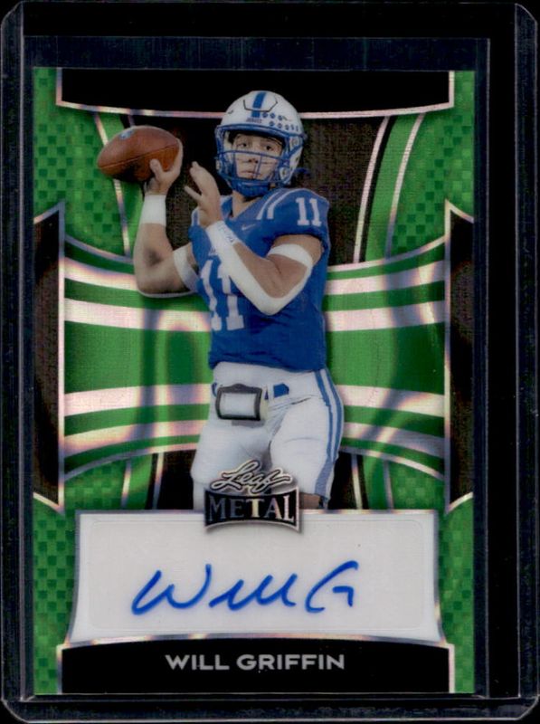 The Will Griffin 2025 Leaf Metal #BA-WG1 Autographs - Lava Green /5 card is 1 of 101 Will Griffin's card variations in the 2025 Leaf Metal set being tracked by Sports Card Investor, including Autographs - Laser Silver, Autographs - Prismatic Silver /25, Prep School Signing - Prismatic Silver /25, Autographs - Prismatic Blue /20, and Prep School Signing - Prismatic Blue /20.