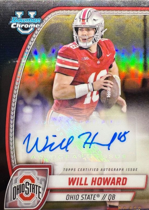This card is 1 of 17 Will Howard's card variations in the 2024 Bowman Chrome University set being tracked by Sports Card Investor, including Image Variation, Prospect Auto, Prospect Auto - Stealth Refractor, Prospect Auto - Refractor /299, and Prospect Auto - Fuchsia Refractor /150.