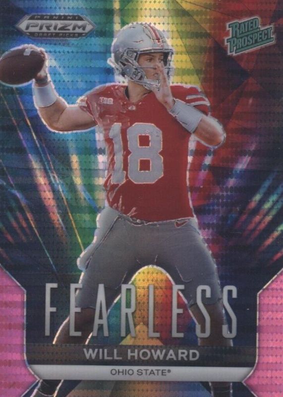 The Will Howard 2024 Prizm Draft Picks #F-WH Fearless - Neon Pink Pulsar /15 card in Raw condition has not changed in price in the last 30 days and was last sold for $15.50 .