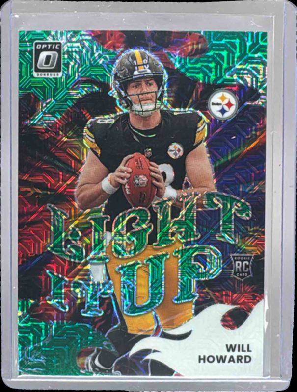 The Will Howard 2025 Optic #7 Light It Up - Dragon /24 Rookie card in Raw condition has moved down -$0.41 (-0.8%) in the last 30 days and was last sold for $52.59 .